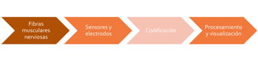 Fibras musculares nerviosas se refiere a aquella área en donde los electros superficiales y sensores actúen. El buen posicionamiento de los electrodos resulta vital para una correcta toma de muestras. La fuerza aplicada durante la contracción muscular va a ser directamente proporcional al tamaño y calidad de la señal reflejada. La codificación y procesamiento de señal EMG traduce la información recopilada en información numérica. En esta parte del proceso actúa el programa diseñado y programada para su posterior interpretación.